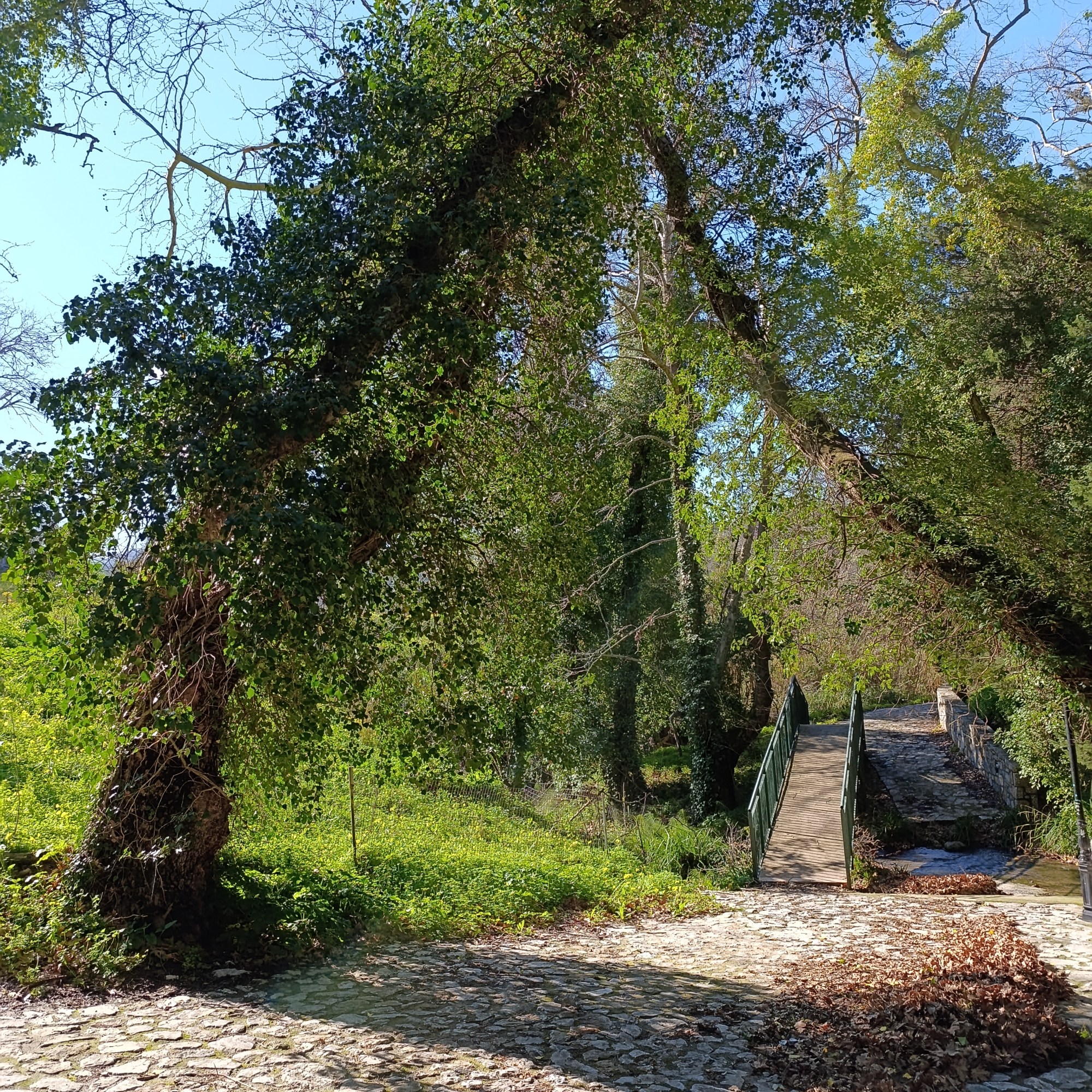 Today, the riverbank is a haven of natural beauty, a peaceful walk shaded by towering plane trees, their bark wrapped in climbing ivy. Fallen autumn leaves soften the earth, and a dragonfly glides past, settling on a leaf beside the clear-running stream.