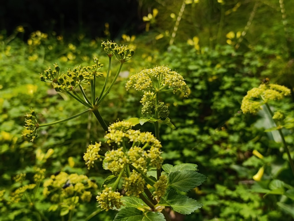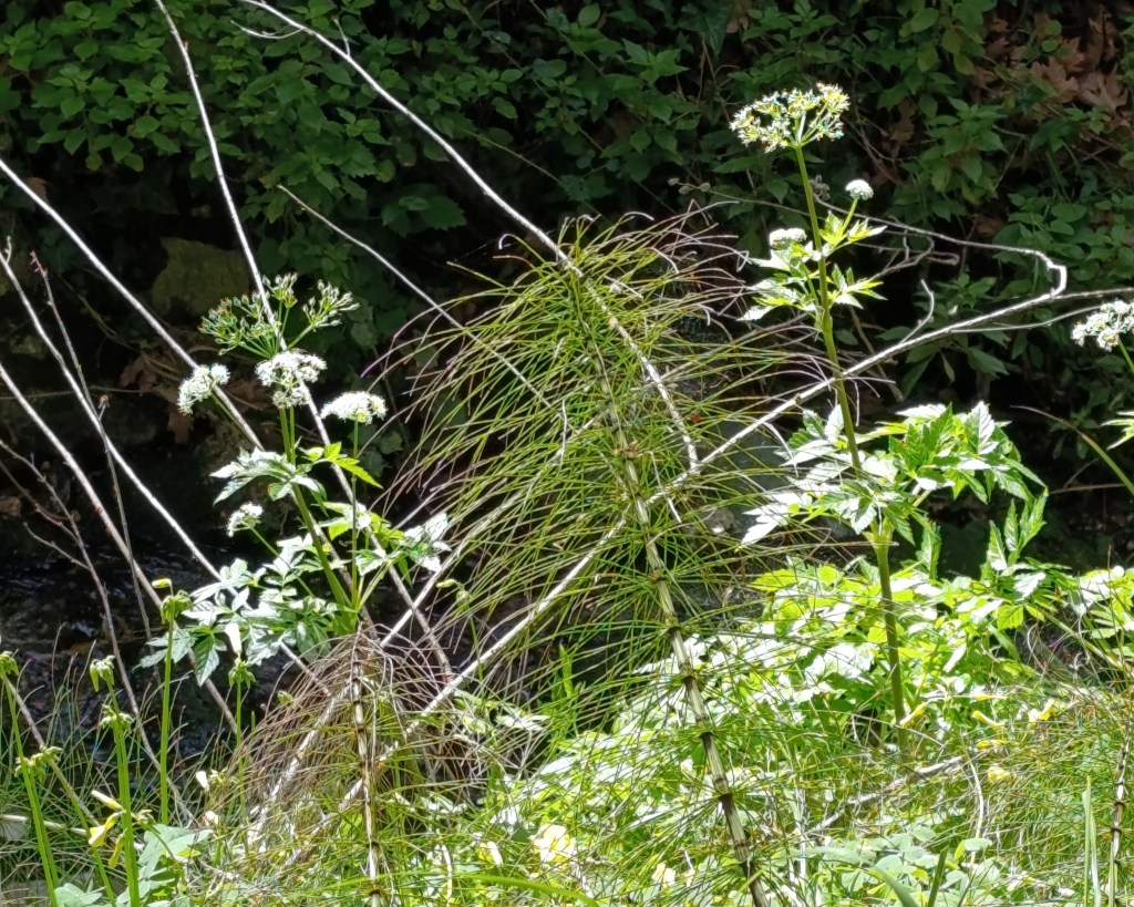 Behind the horsetail, wild angelica (Angelica sylvestris), also known as the holy ghost or woodland Angelica, grows near the river. It has a sweet, carrot-like aroma and prefers damp areas and river banks, making close observation challenging. It’s flowers form large, umbrella-shaped clusters (umbels) of small white flowers, and its divided, pinnate leaves have a slightly inflated sheath at the base where they join the main stem.