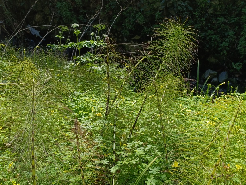 This ancient Horsetail species (below) has survived for 300 million years, predating the Mesozoic age when dinosaurs roamed the Earth. It grows beside streams, with underground roots that form intricate systems, extending down to 2 meters deep. If a piece comes away, it can float downstream and establish new colonies. The tiny black-tipped scales along the stems are leaves, but they are so small that the stems perform most of the photosynthesis. This plant produces spores instead of flowers.