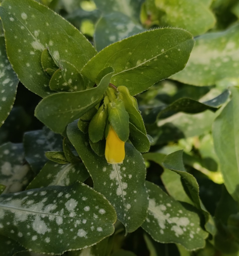 As I walked along the path, I spotted honeywort, Cerinthe major L, growing in the damp undergrowth beneath the tall plane trees. Its yellow, tube-shaped flowers stood out among leafy bracts and broad green leaves marked with white splashes and rounded edges.