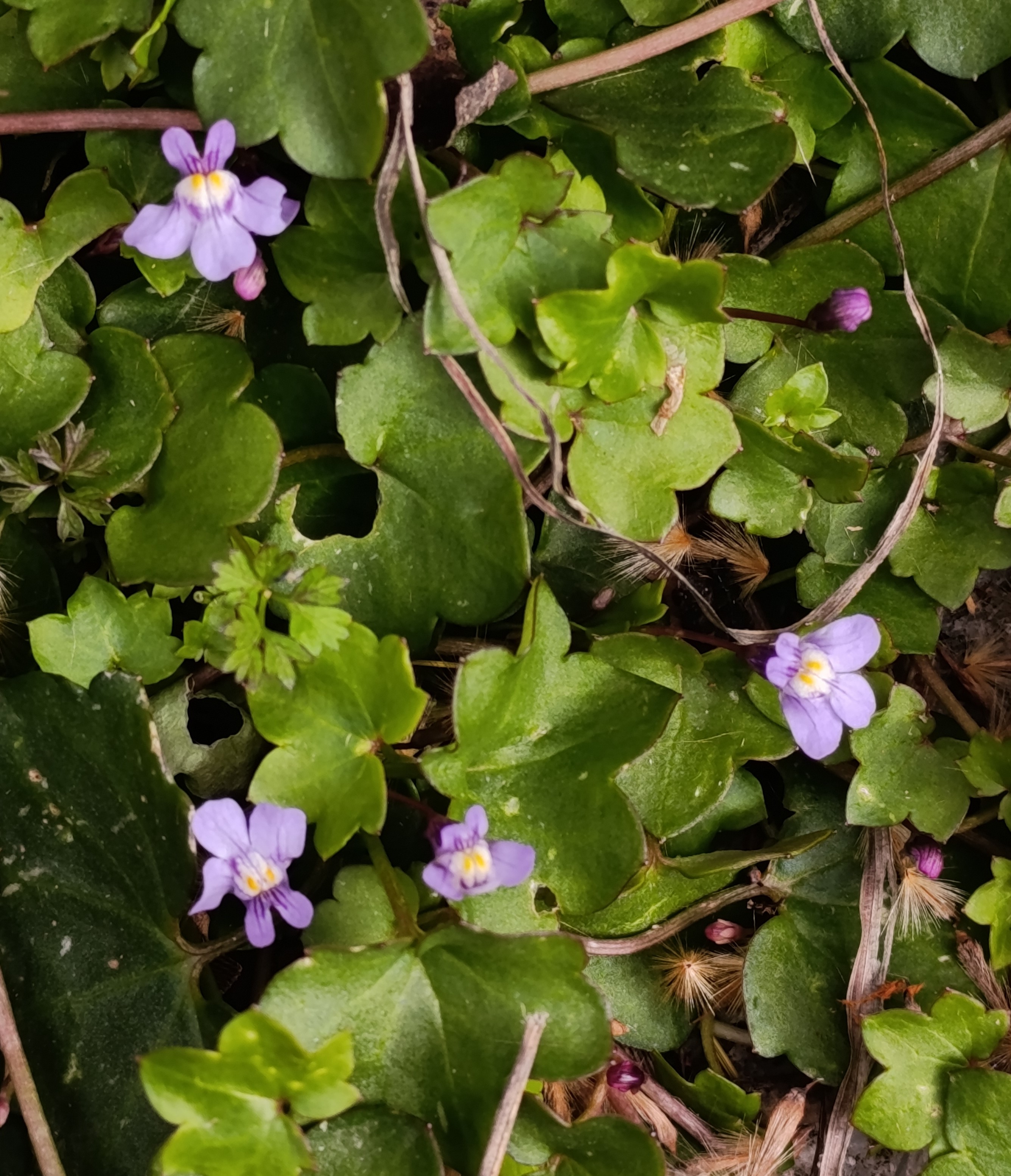 Ivy-leaved toadflax (Cymbalaria muralis), above left, often called the mother of thousands, trails delicately over stone walls, between rocks, along pavements, and at the base of old trees. Its lilac flowers, traced with fine dark lines on the upper lobes, open like tiny faces. Beneath the mouth, two pale lips carry yellow blotches, giving the blooms a lively, almost playful expression. The leaves are thick, rounded and heart-shaped, divided into three to seven, gentle lobes, often tinged with purple underneath. Though small, the flowers resemble miniature snap-dragons, each one a wondrous surprise tucked into the cracks and crevices of the landscape.