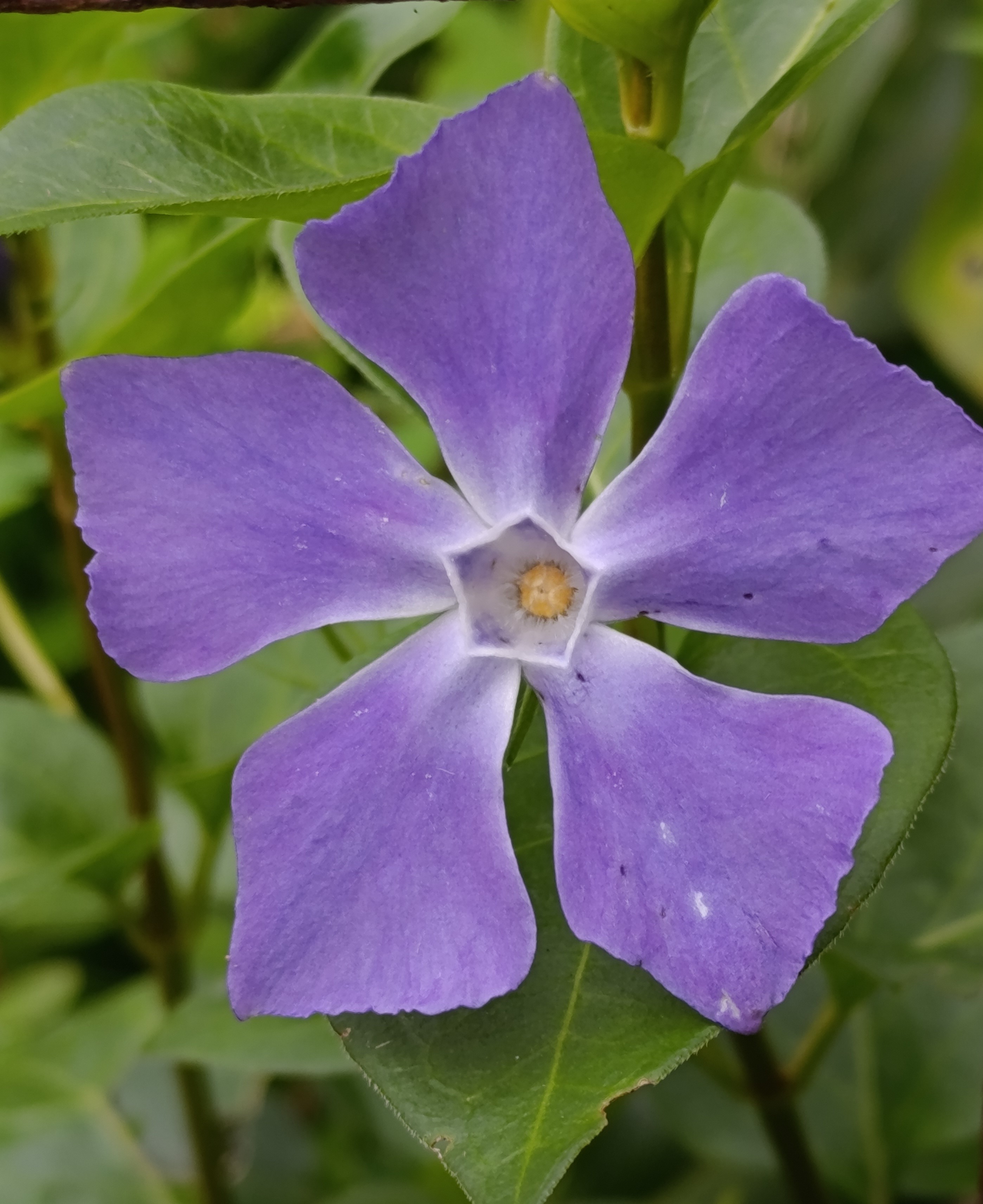 The Greater periwinkle (Vinca major), pictured above right, unfurls along the ground with trailing arcs, its bright blue-violet flowers glowing like small stars against the greenery. Each bloom carries five soft petals, brushed with a hint of white and gathered around a pale central tube. The upper leaves are broad and lance-shaped, while the lower ones form heart-shaped silhouettes on short stalks, giving the plant a graceful, layered appearance.