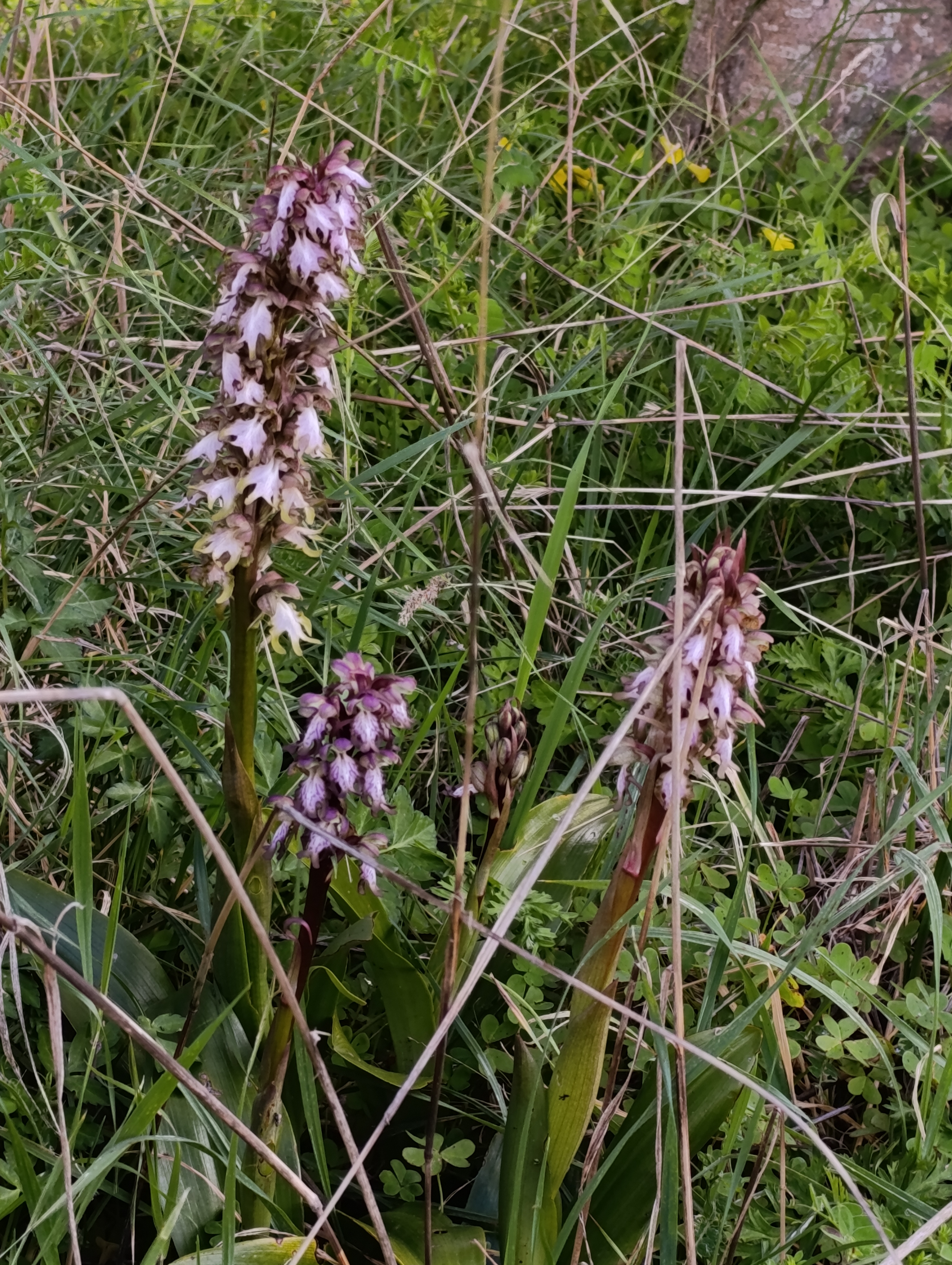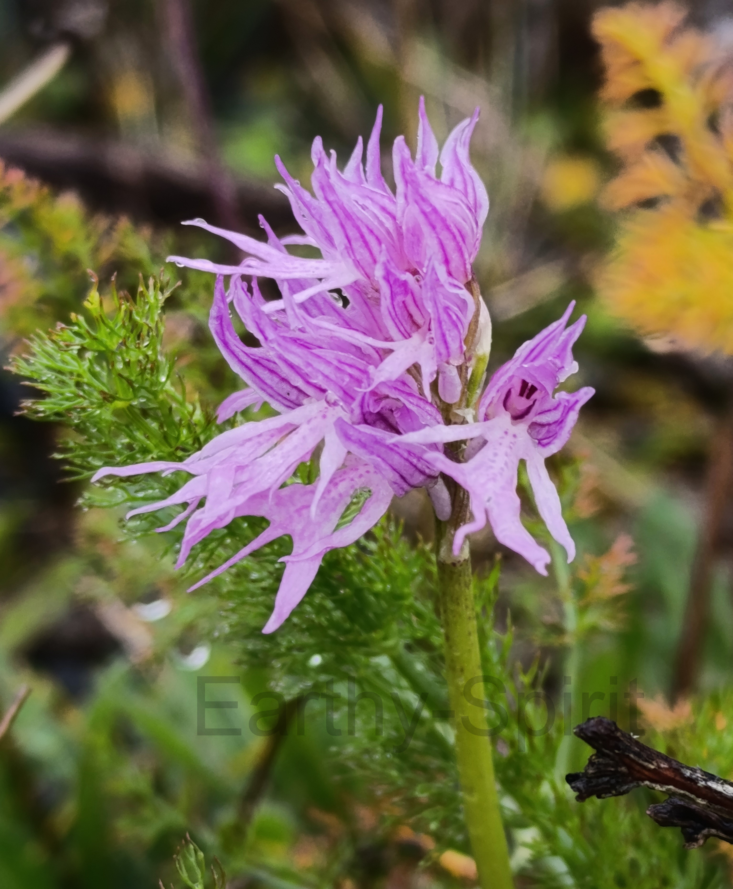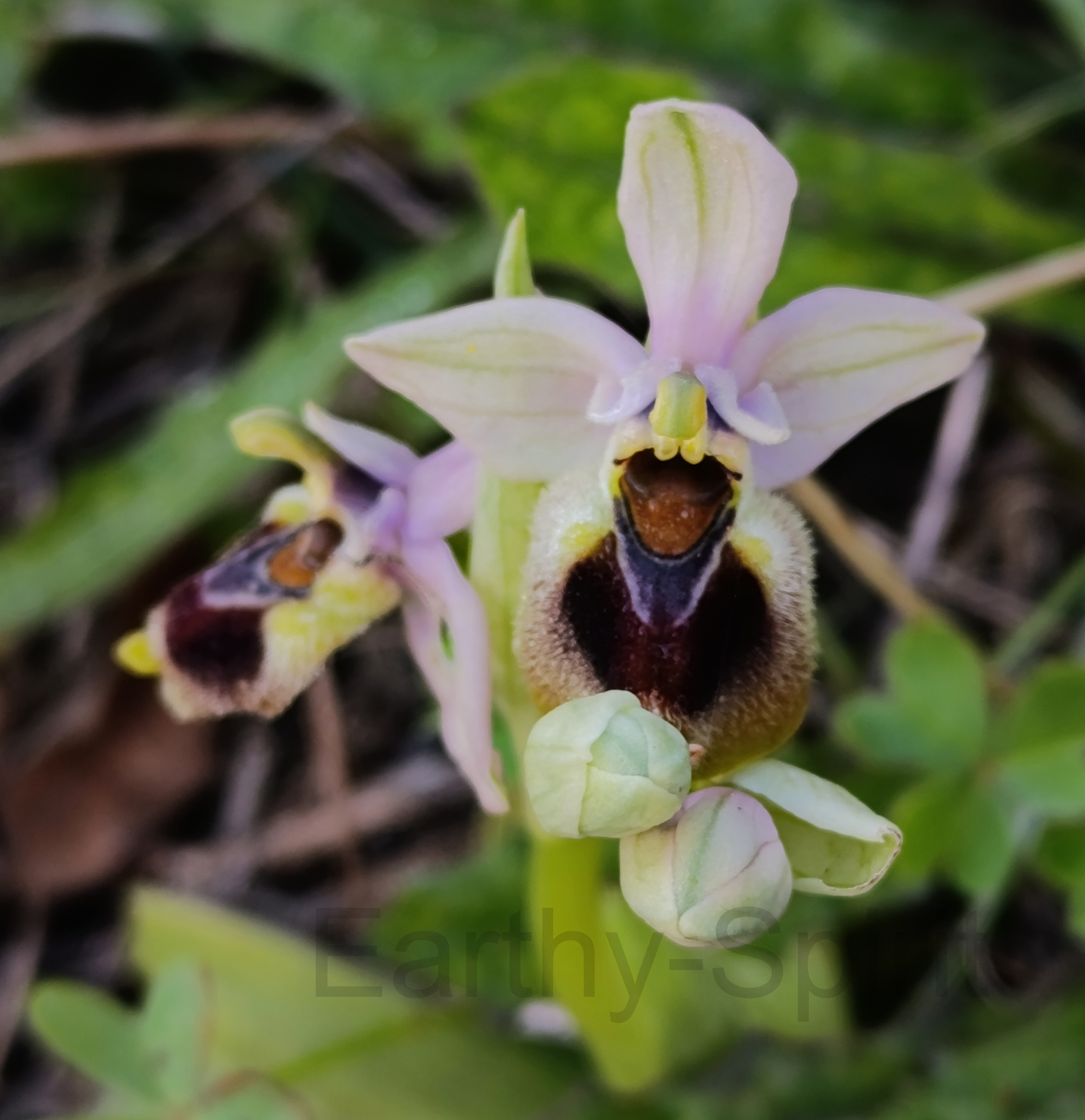 An orchid, opening its first blooms in spring, within the undergrowth.
