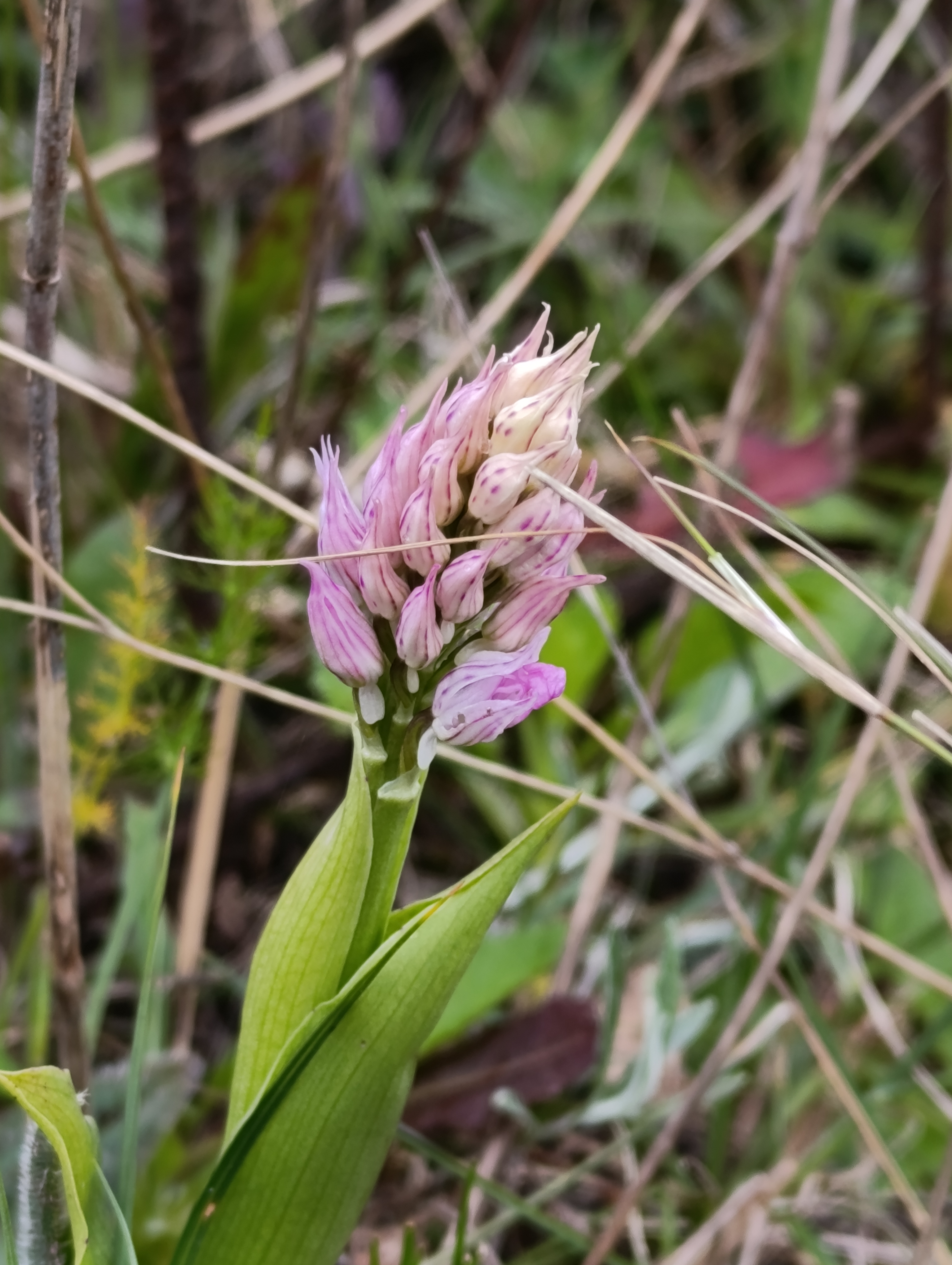 Orchis quadripunctata, the four-spotted orchid above, is a low-growing species reaching 5-40cm. Its dark red stem supports white to pink flowers, with a three-lobed lip, paler at the base and marked with up to four deep purple spots. At ground level, a rosette of oblong to narrow ovate leaves anchors the plant.