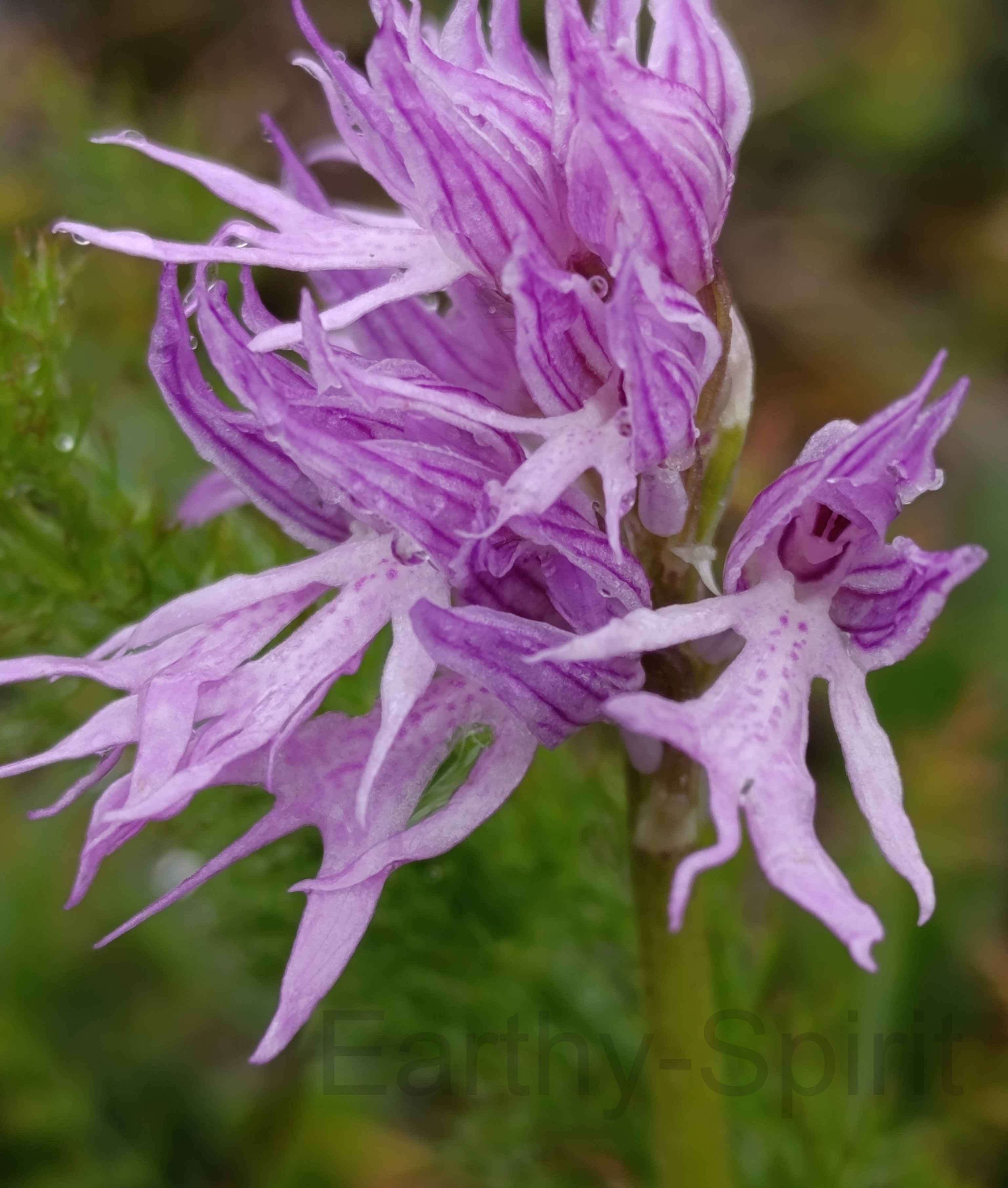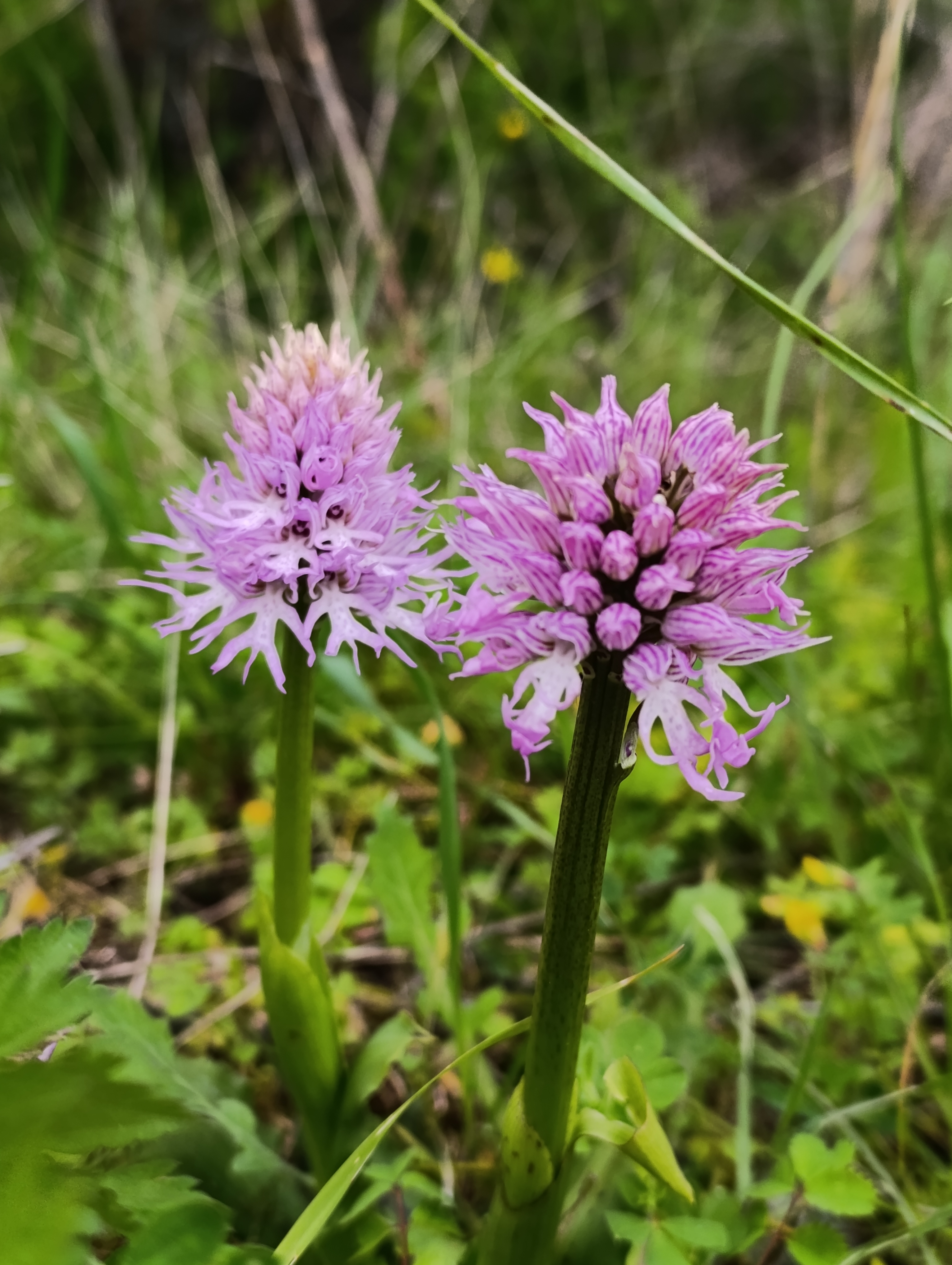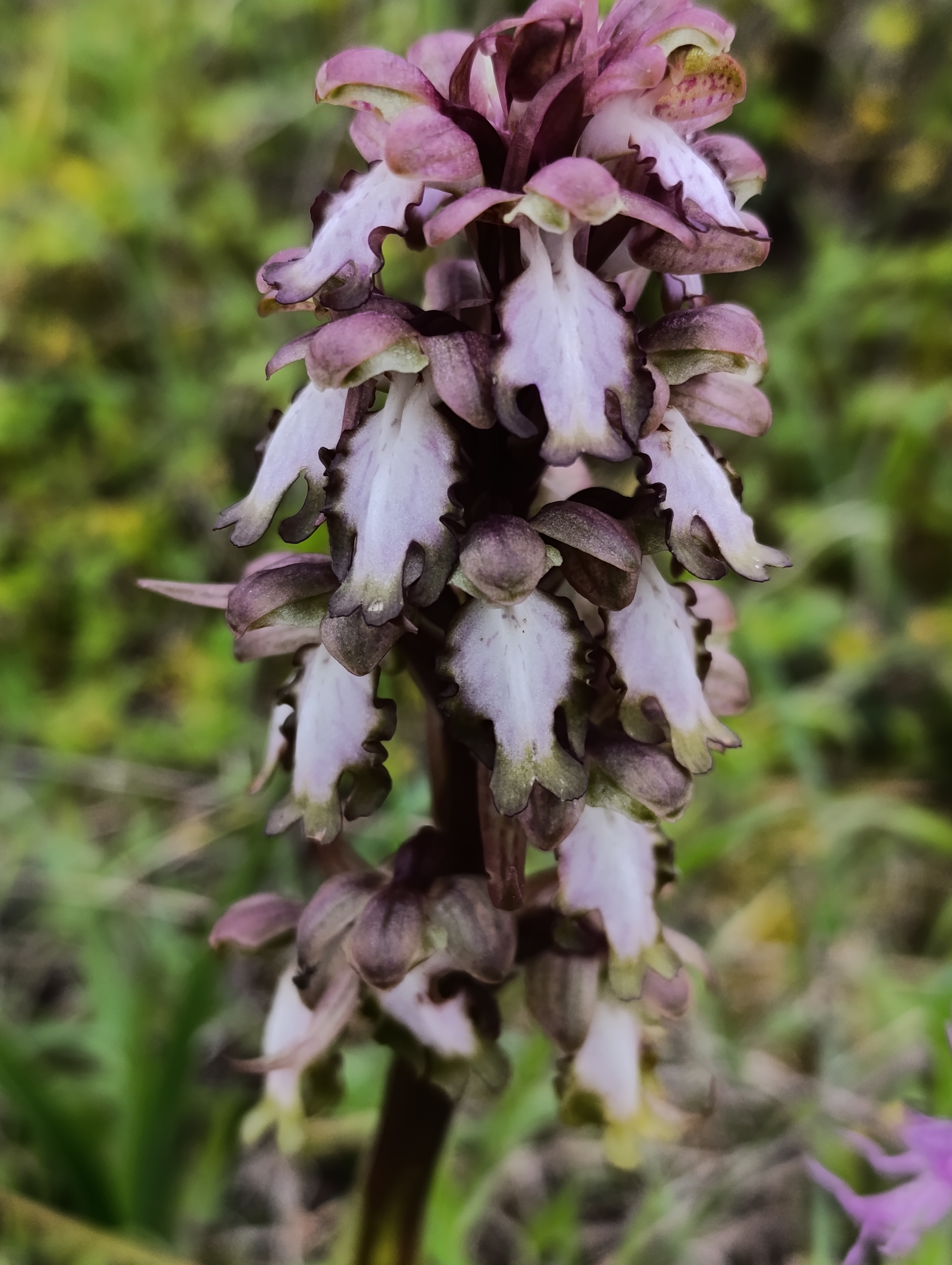 This orchid, Orchis italica, the wavy-leaved monkey orchid, also called the naked man orchid, forms rounded or pyramid-shaped spikes tightly packed with flowers. Their colours range from soft white to deep pink, each bloom shaped like a tiny satyr or monkey, complete with a smiling face, body, limbs, and a playful tail or phallus. The upper petals and sepals gather into a hood with pointed, striped, ‘ears’, giving the plant its unmistakable character. At the base, wavy-edged leaves form a rosette, sometimes marked with dark spots. This species thrives across the Mediterranean, especially in pinewoods, grasslands, and along the edges of olive groves and fallow fields.