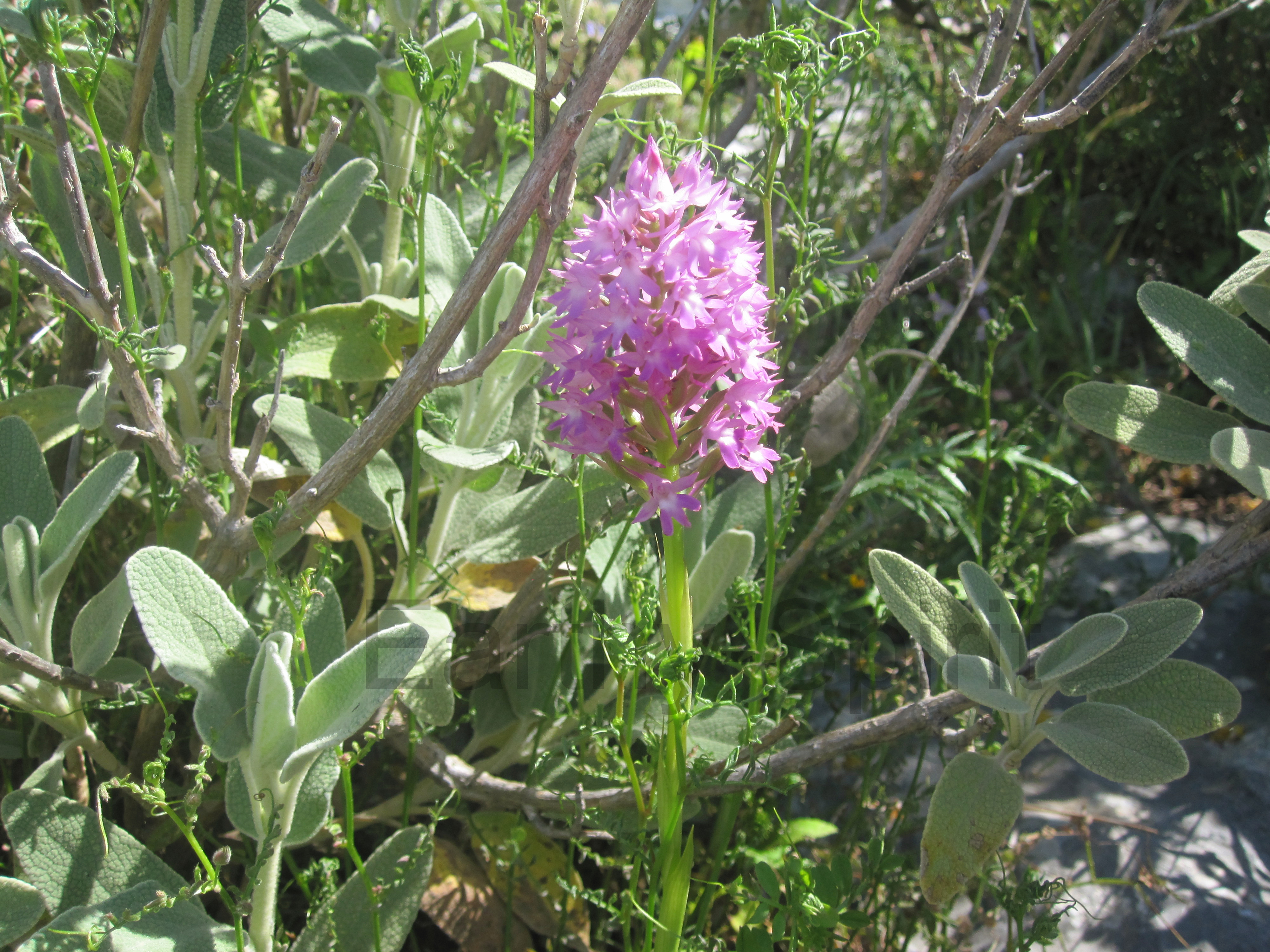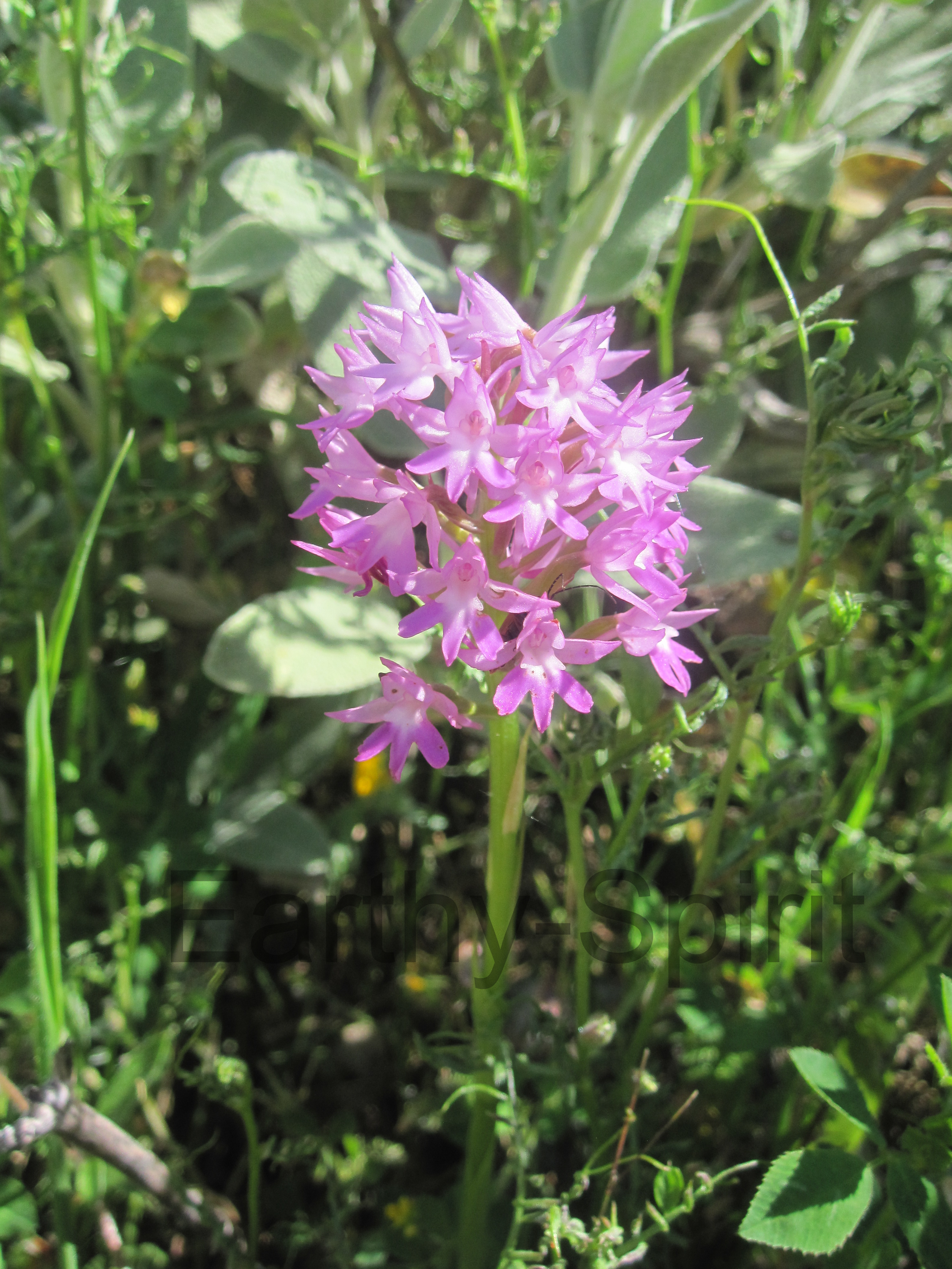 The Pyramidal orchid, Anacamptis pyramidlis above, is a familiar sight in central and southern Europe. Its pyramid-shaped flower spike forms a dense cluster of white, pale pink to purple blooms on a slender stem 15-40 cm tall. The upright lance-shaped leaves often wither before flowering, although smaller leaves continue up the stem. It grows in scrubland, meadows and open grasslands.