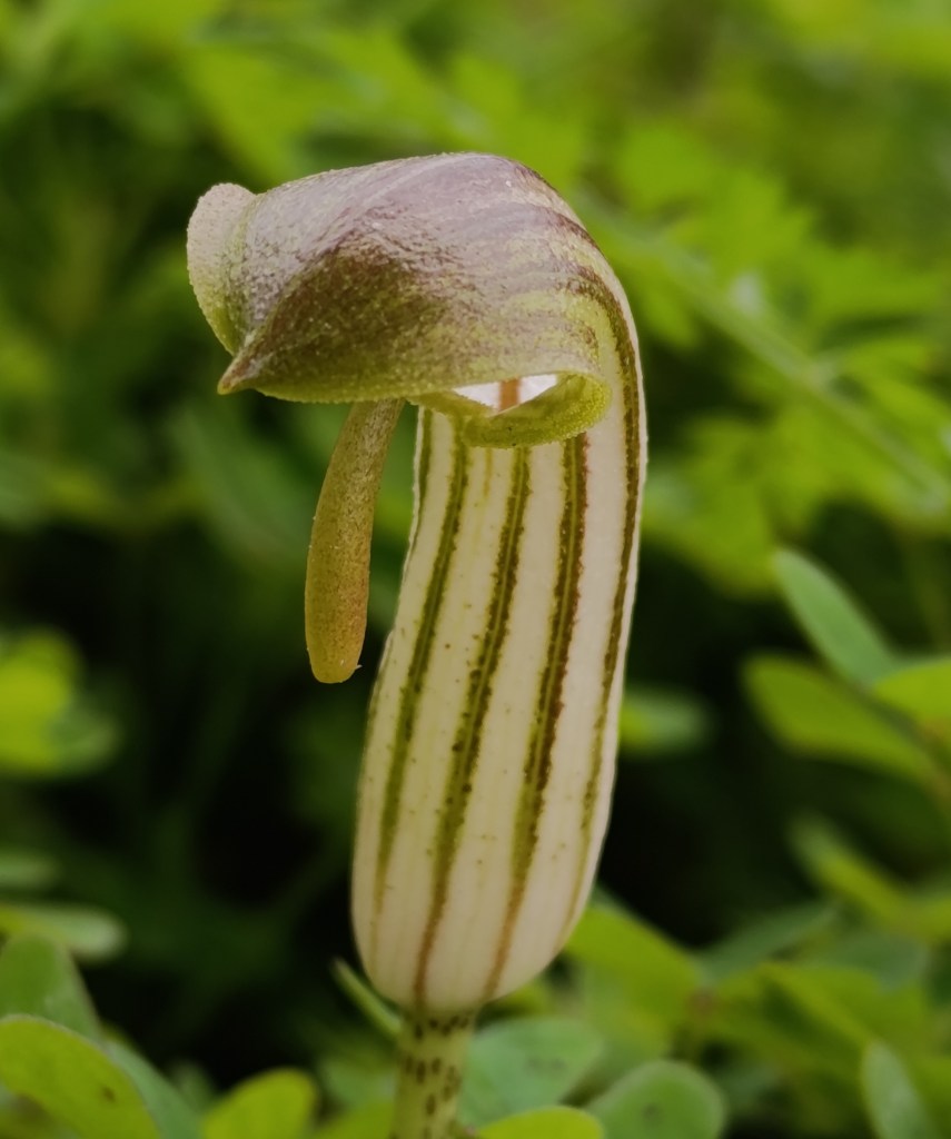 The Friar’s cowl (Arisarum vulgare)also springs up from the stony undergrowth, with its leaf-like bract forming a tube, a curved lip, and green-brown stripes that resemble a loose hood, similar to those of a monk’s habit. Its leaves are large and heart-shaped, and it grows in uncultivated fields, forests, rocky shrubland, and sometimes by roadsides in rural areas.