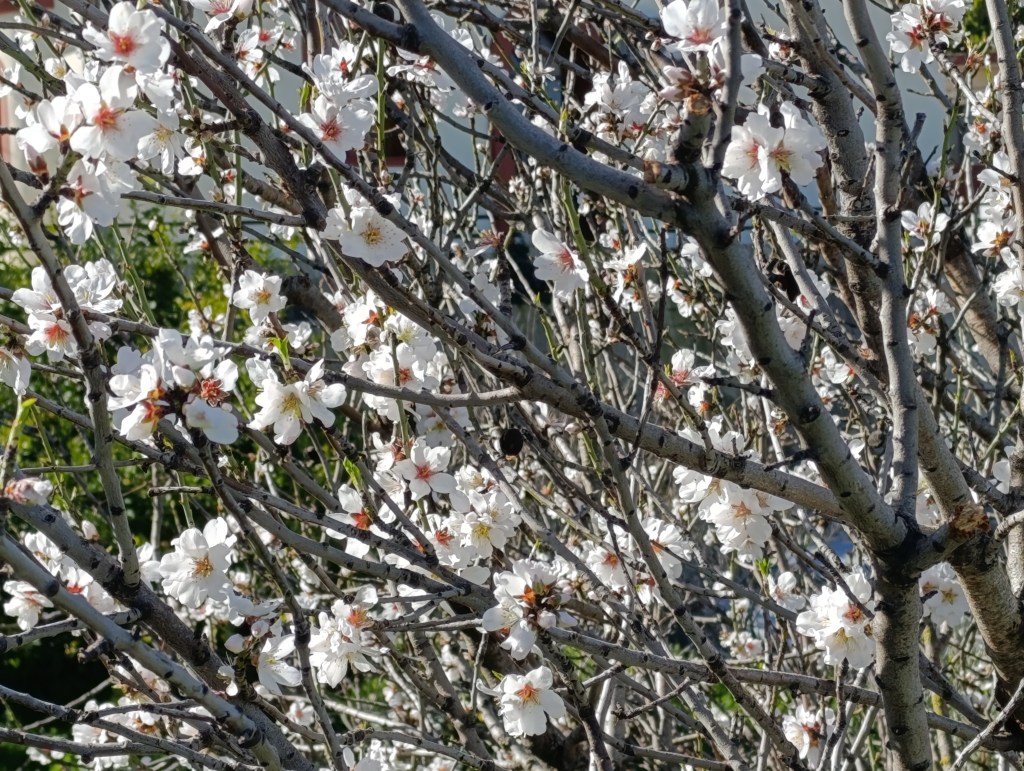 Almond trees burst into bloom, filling the air with a delicate, enchanting aroma that draws bees and pollinators near. Their white and pale pink blossoms, crowned with golden stamens, transform the landscape with beauty and fragrance.
