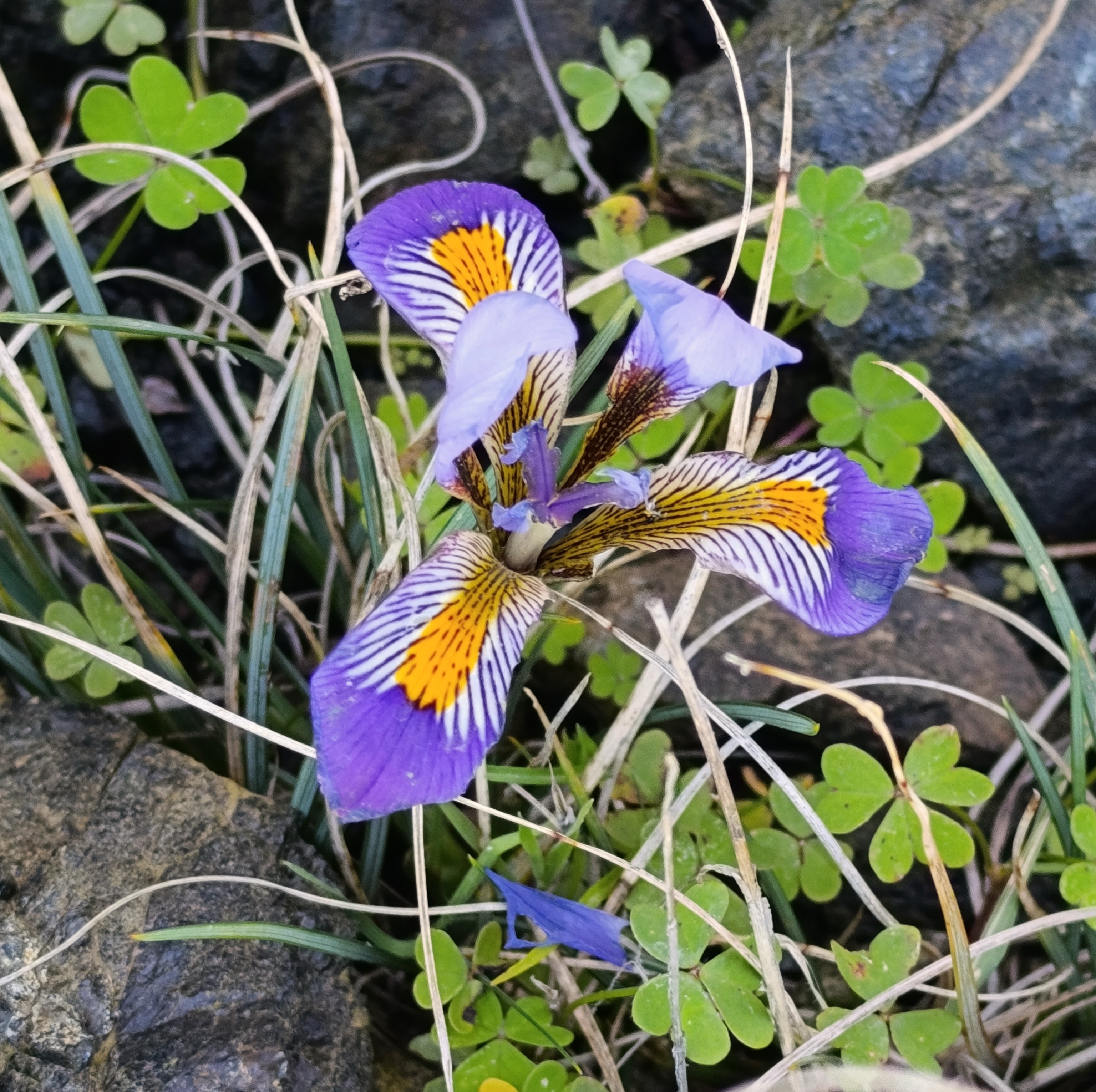Iris cretensis, shown on the right below, has striking violet flowers with yellow and white patterns on its petals. It grows among straight, grass-like leaves in rocky places, low shrubland, and on slopes.