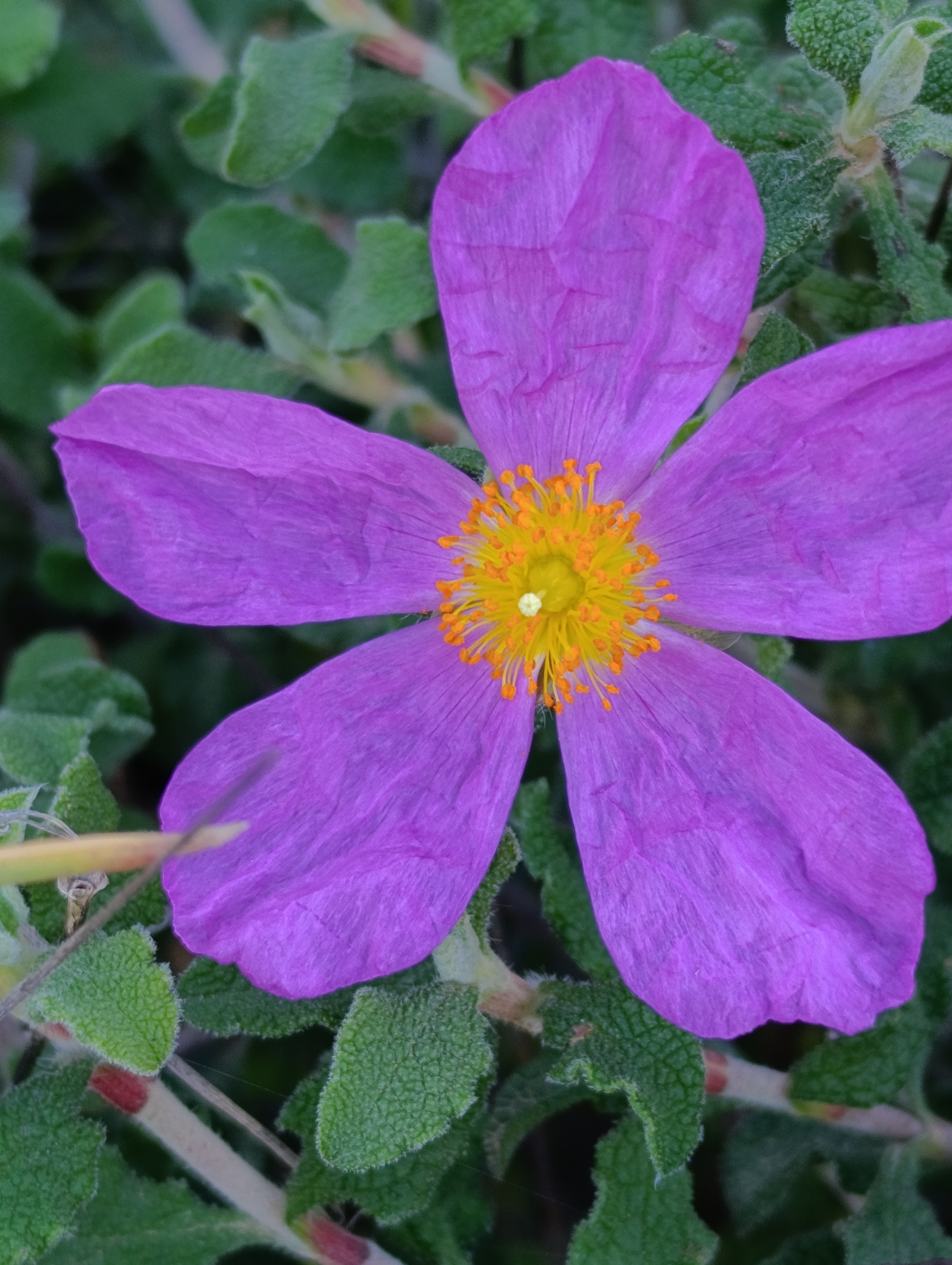 Cistus creticus, below left, is a lovely aromatic shrub with striking purple-pink to rose-pink flowers and golden stamens. Its narrow lanceolate leaves have a silvery shine due to their soft grey hairs. The resin, labdanum from this plant, was once used in perfumery and medicine.