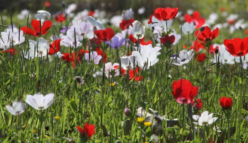 Anemone pavonina is the glowing-amber anemone -it’s vivid red petals, pale in the centre, and dark purple anthers light up entire pine forests, meadows, and uncultivated fields from February to May. Although pink and violet forms exist, the red anemones are the most striking, like splashes of red dotted around the landscape.